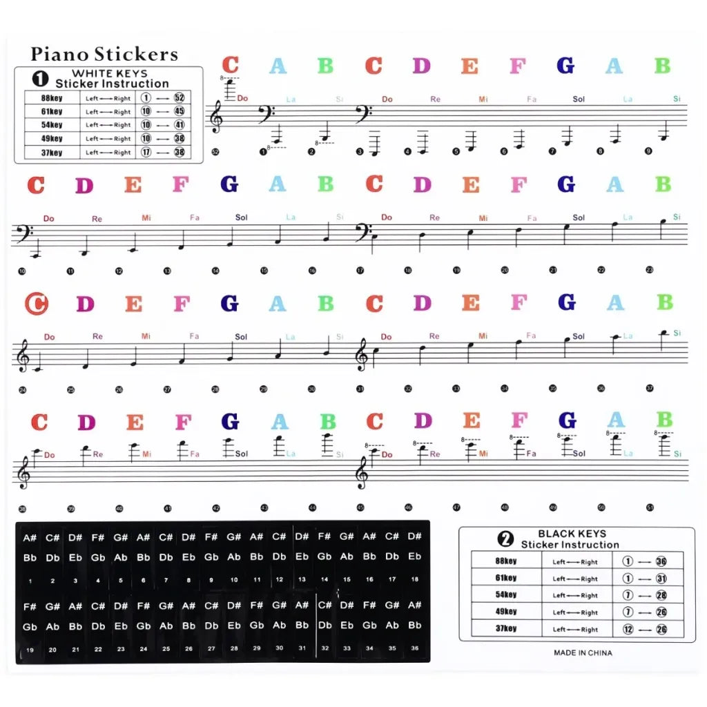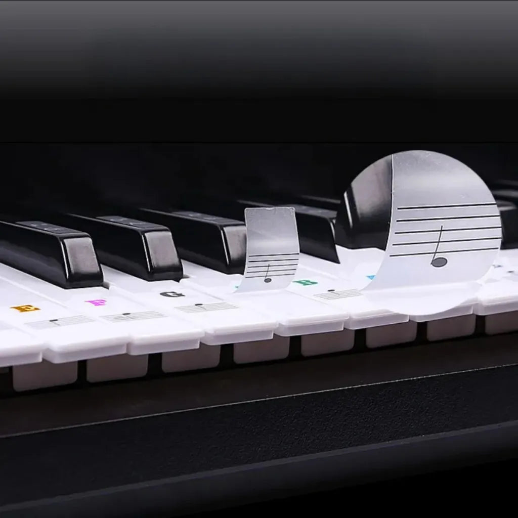 Sættet indeholder klistermærker til både hvide og sorte tangenter og kan bruges på alle instrumenter fra 37 til 88 tangenter – uanset om du spiller på digitalpiano, keyboard eller akustisk klaver.